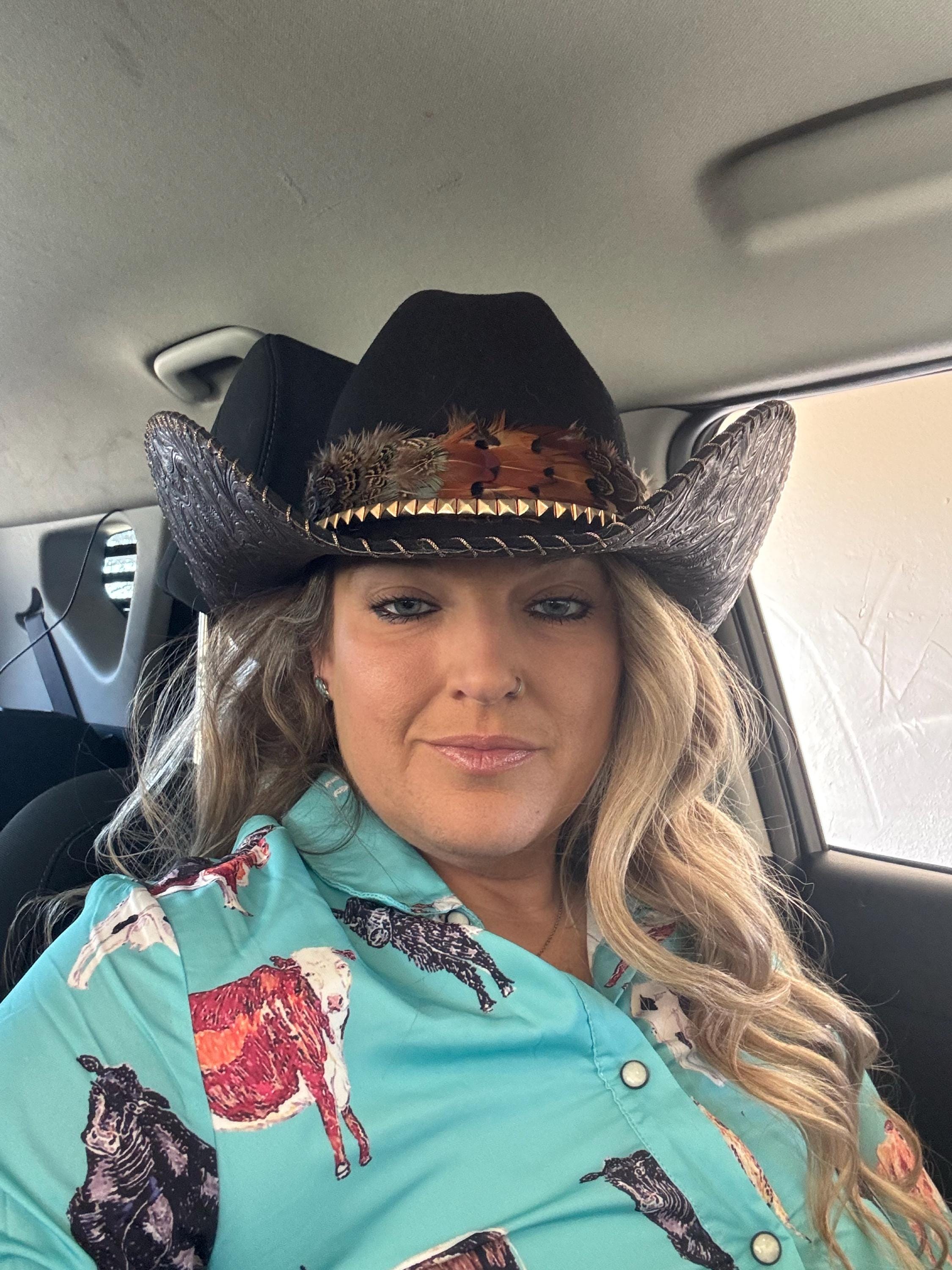 Crafted from 100% premium wool, the Night Horizon features a deep black crown that embodies classic Western style with a modern edge. The underside of the brim is lined with rich brown tooled leather, highlighting skilled craftsmanship and textured detail. Topped with a feather-adorned hat band with gold accents, this hat delivers a striking blend of rugged tradition and refined elegance—designed for those who make their mark wherever they ride.